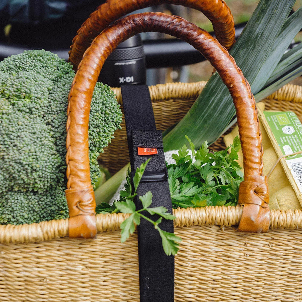 La Maxi Strap assure un transport sûr de tes bagages sur un porte-bagages avant ou arrière. Avec une longueur maximale de 75 cm, c’est le modèle le plus long de la gamme de sangles de serrage pour porte-bagages FAHRER et il est particulièrement adapté au porte-bagages avant des vélos électriques Riese & Müller. Qu’il s’agisse du sac pour le bureau, d’une sortie à vélo ou d’une couverture pour une journée au bord du lac, la sangle de serrage élastique du porte-bagages maintient le chargement en place de manière fiable.